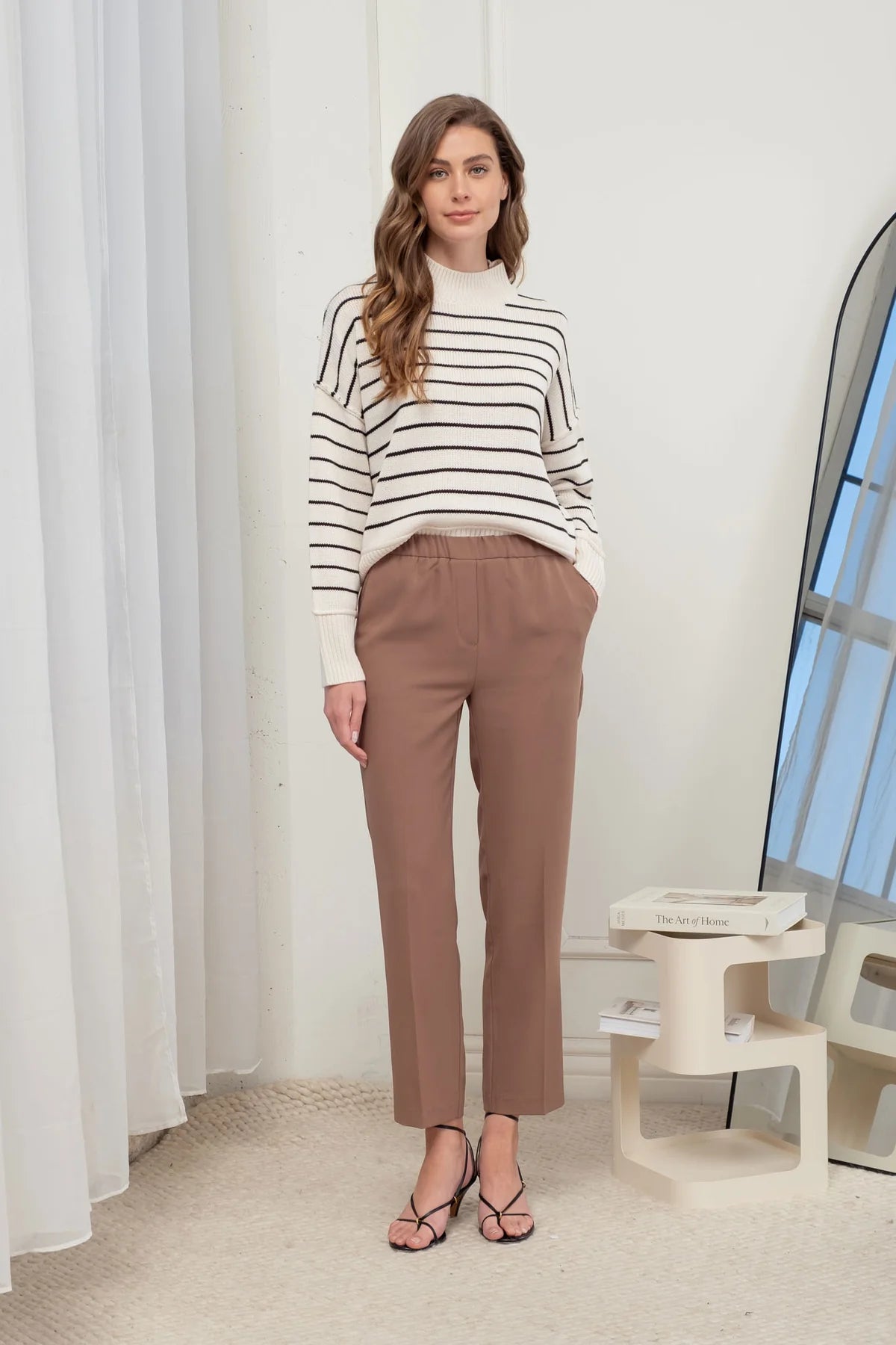 Elastic waist high rise pockets in the back, mock pockets straight fit lined dress pants