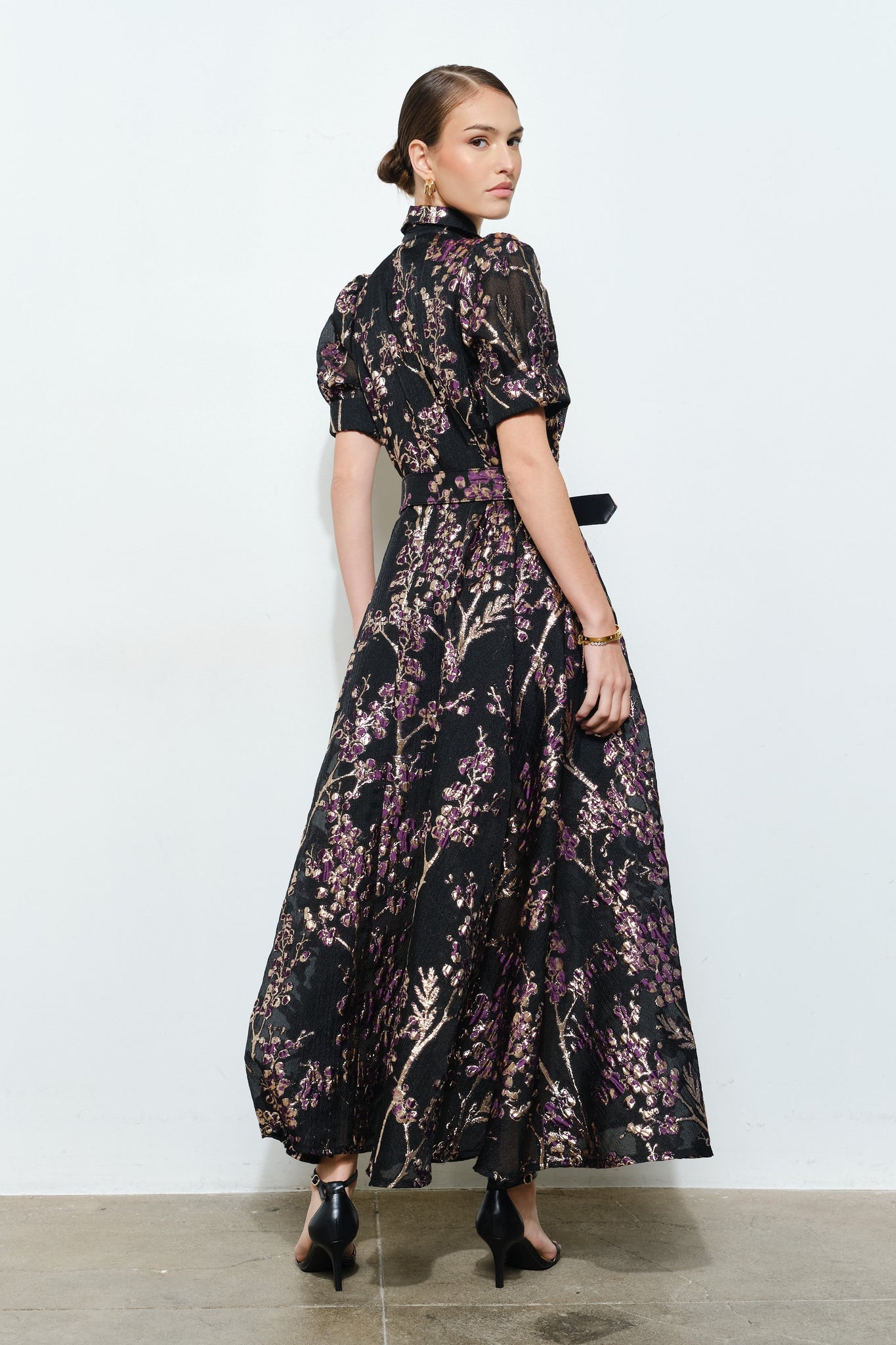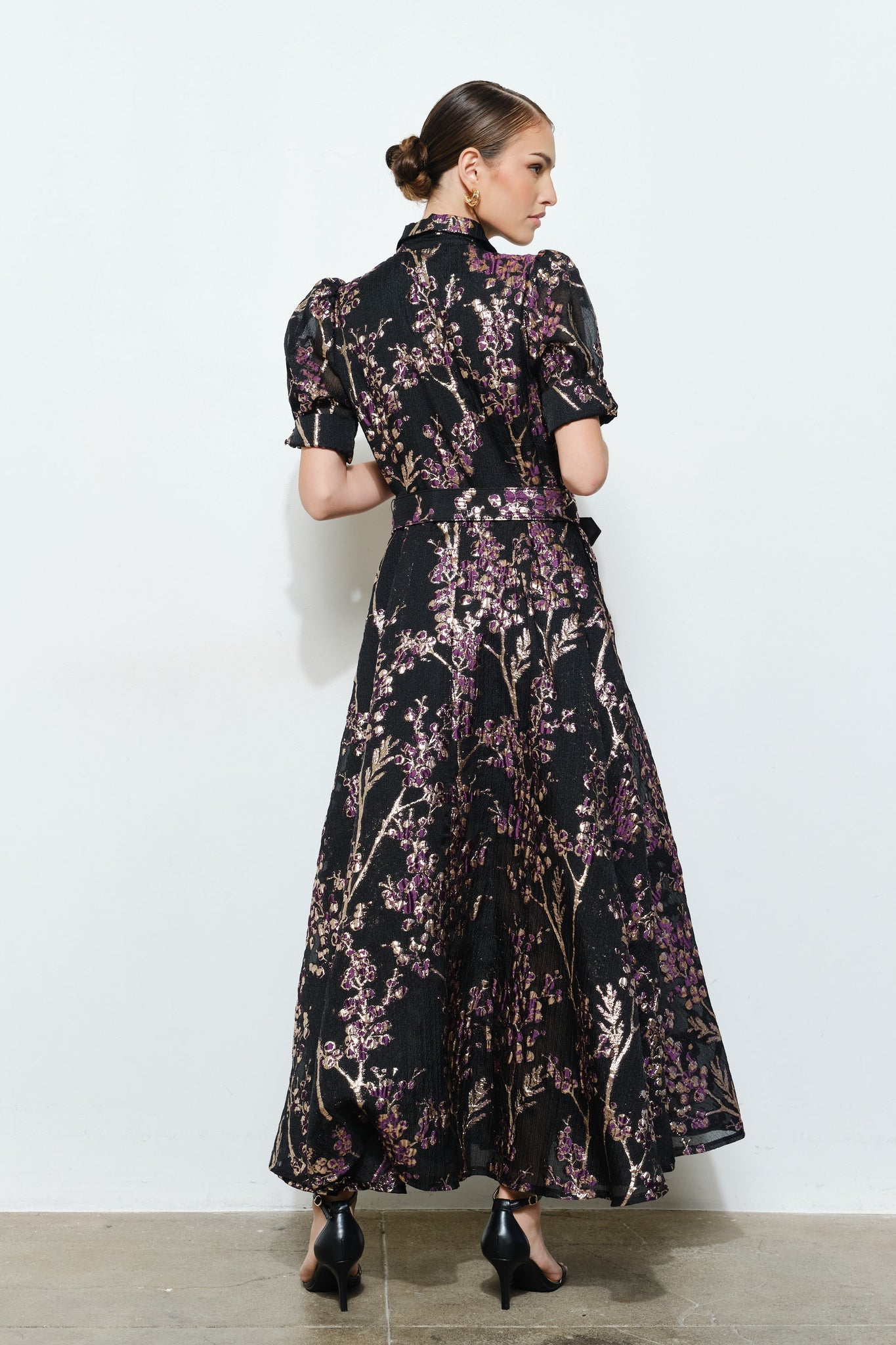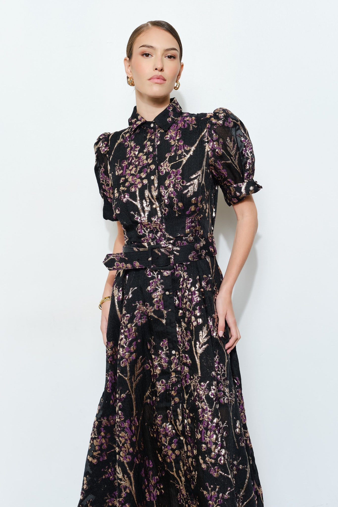 Luxury Golden Lurex Floral Stich Embellished Jeweled Button Down with Collared Neck Short Bubble Sleeves Waist Self Belted Comfortable Fit Maxi Dress