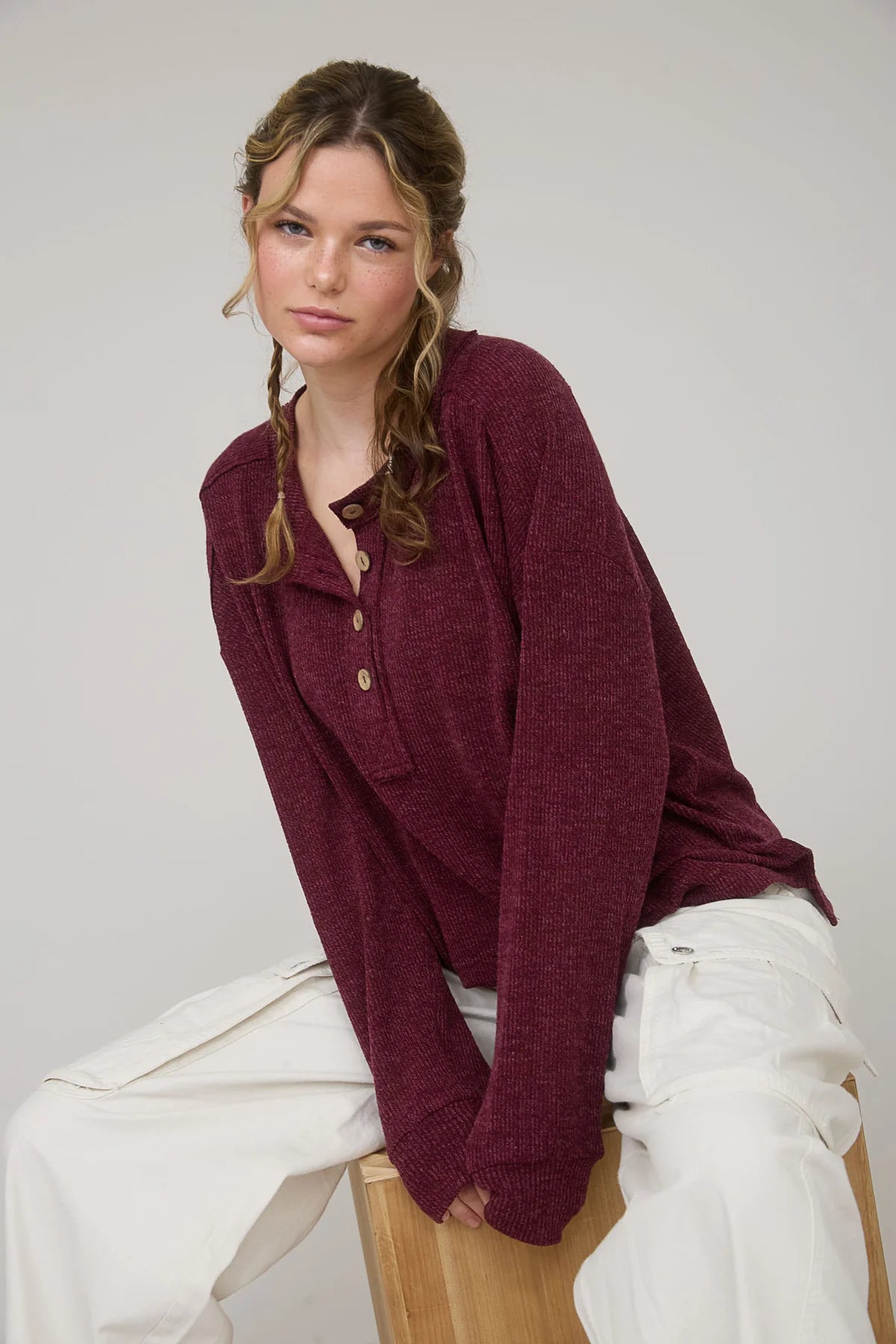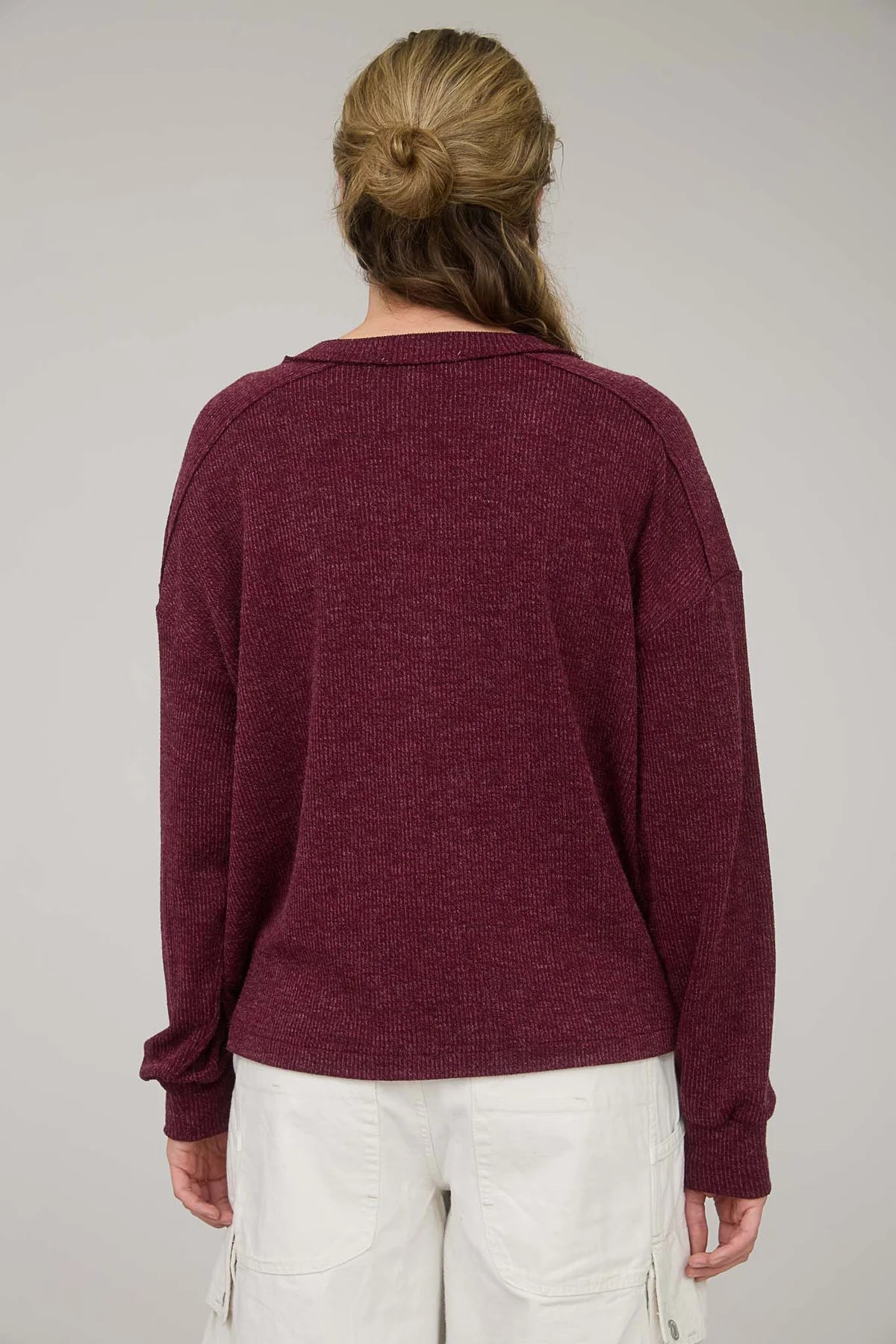 Round neck, Half button henley neckline, Long sleeve relaxed fit, Ribbed knit top