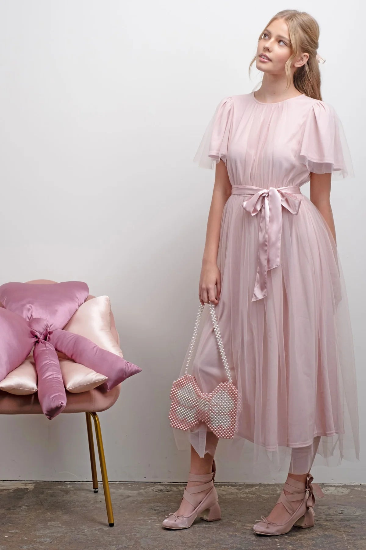 Round neckline, short bell sleeves elasticized waist belt loops self-tie bow belt, tulle overlay solid midi dress